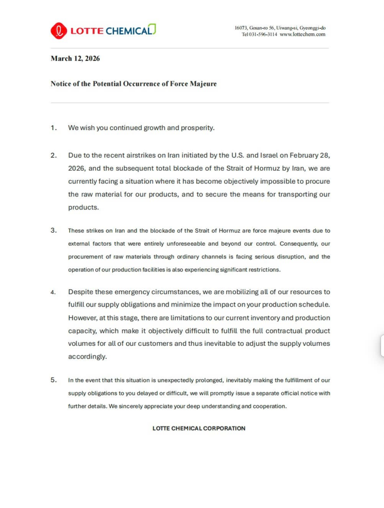 Lotte Chemical has issued a notice on the potential occurrence of force majeure following recent airstrikes on Iran and the blockade of the Strait of Hormuz. The disruption has made it difficult to secure raw materials and transportation, impacting production and supply operations. The company warned that supply volumes to customers may be adjusted if the situation continues.